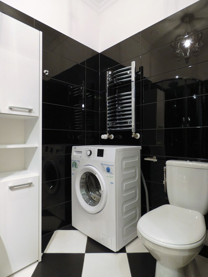 Łazienka (razem z WC): kabina prysznicowa, umywalka, lustro, pralka, szafka.