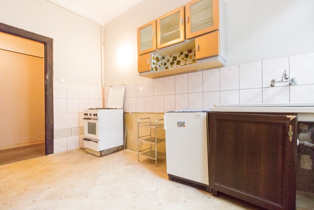 Kuchnia z dostępem do pomieszczenia gospodarczego: meble kuchenne, kuchenka gazowa z piekarnikiem, lodówka.
