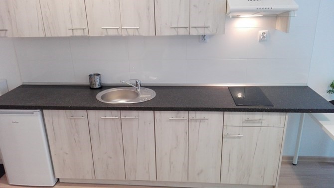 Aneks kuchenny: szafki wiszące i stojące, zlewozmywak, lodówka, kuchenka, okap.