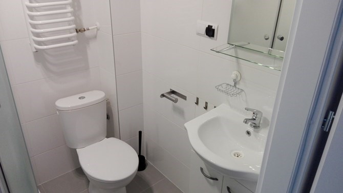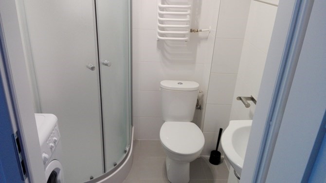 Łazienka: kabina prysznicowa, WC, umywalka, pralka.