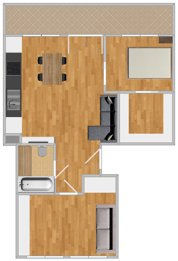 *A bedroom with a large wardrobe; living room with kitchenette; an additional room, which can be a children's room, a study or a second bedroom; bathroom with bathtub; big balcony.