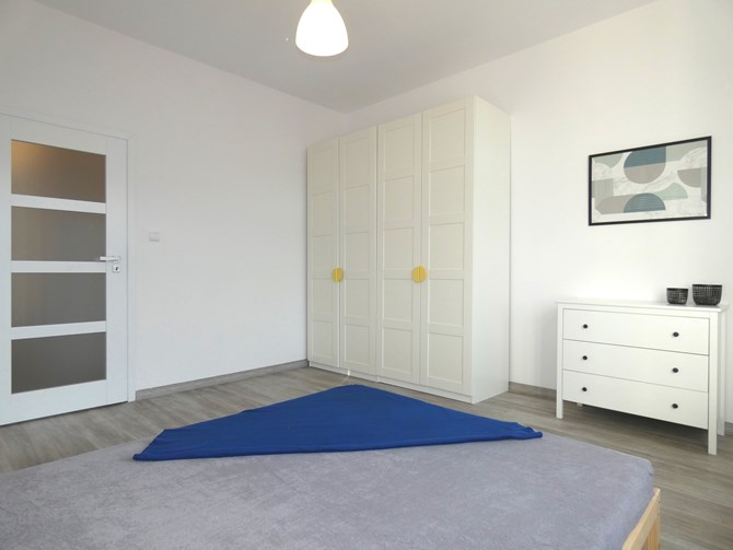 Sypialnia: łóżko podwójne, dwie szafy, komoda.