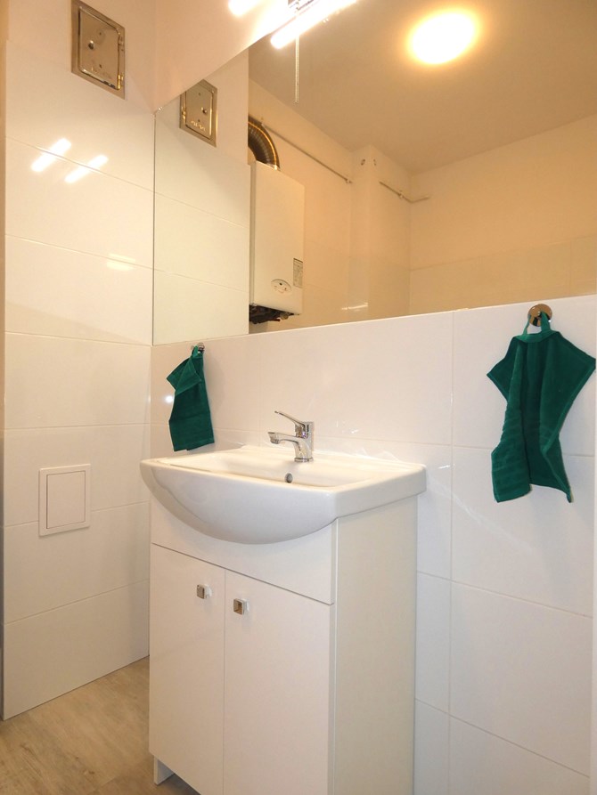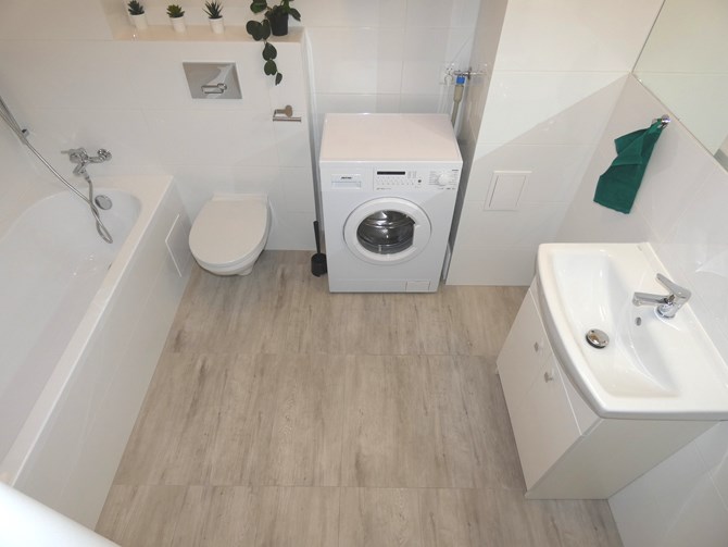 Łazienka razem z WC: lustro z półką, wanna, pralka.