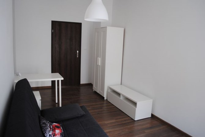 Pokój: 2-osobowe rozkładane łóżko, pojemna szafa, regał pod tv oraz biurko