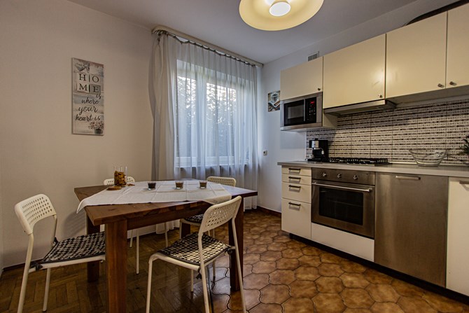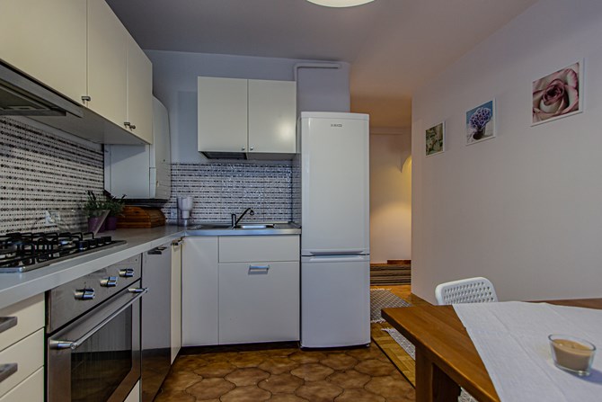 Kuchnia: płyta grzewcza, piekarnik, duża lodówka.