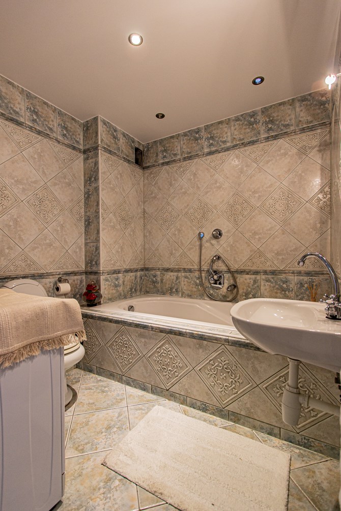 Łazienka z WC: duża wanna w zabudowie, umywalka, pralka, lustro.