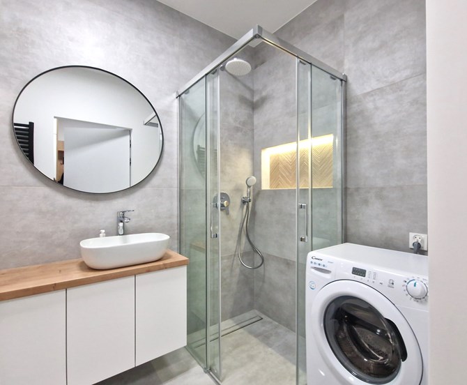 Łazienka (razem z WC): pralka, kabina, umywalka, lustro, szafki.
