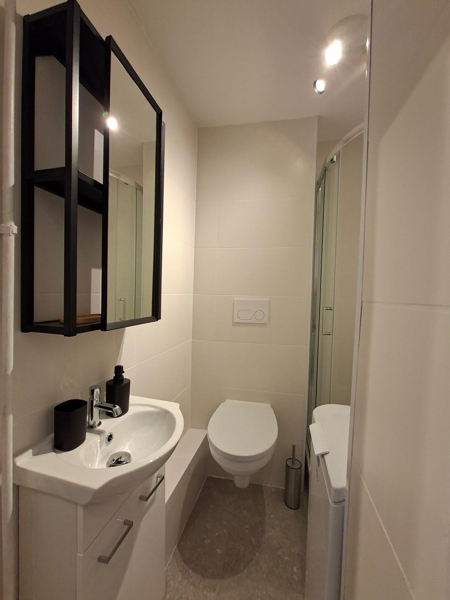 Łazienka z WC: prysznic, umywalka, pralka, szafka, lustro.