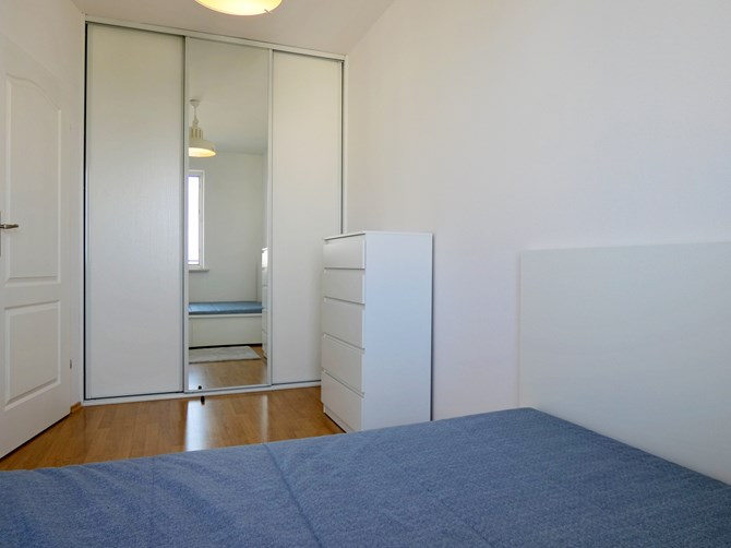 Sypialnia: podwójne łóżko z materacem, komoda, szafa wnękowa.