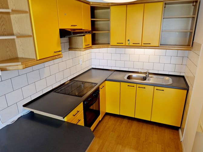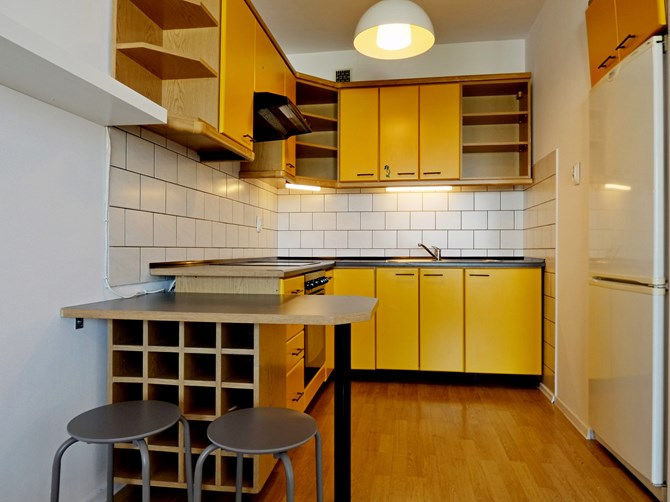Kuchnia: lodówko-zamrażarka, piekarnik, płyta ceramiczna (4-palnikowa), okap, czajnik elektryczny, zlew, stół, 2 taborety.