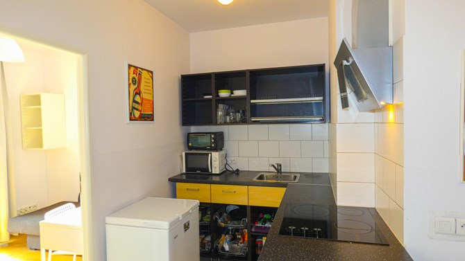 Kuchnia: szafki, lodówka, płyta elektryczna, zlewozmywak, okap, mikrofalówka, pralka