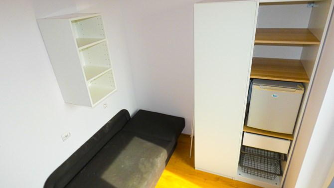Pokój: lóżko, szafa, lodówka, biurko, krzesła, półki wiszące.