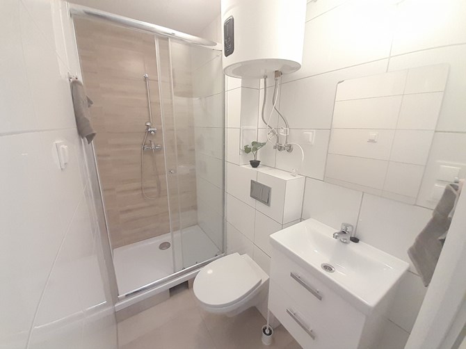Łazienka z WC: kabina prysznicowa, umywalka, szafka, lustro.