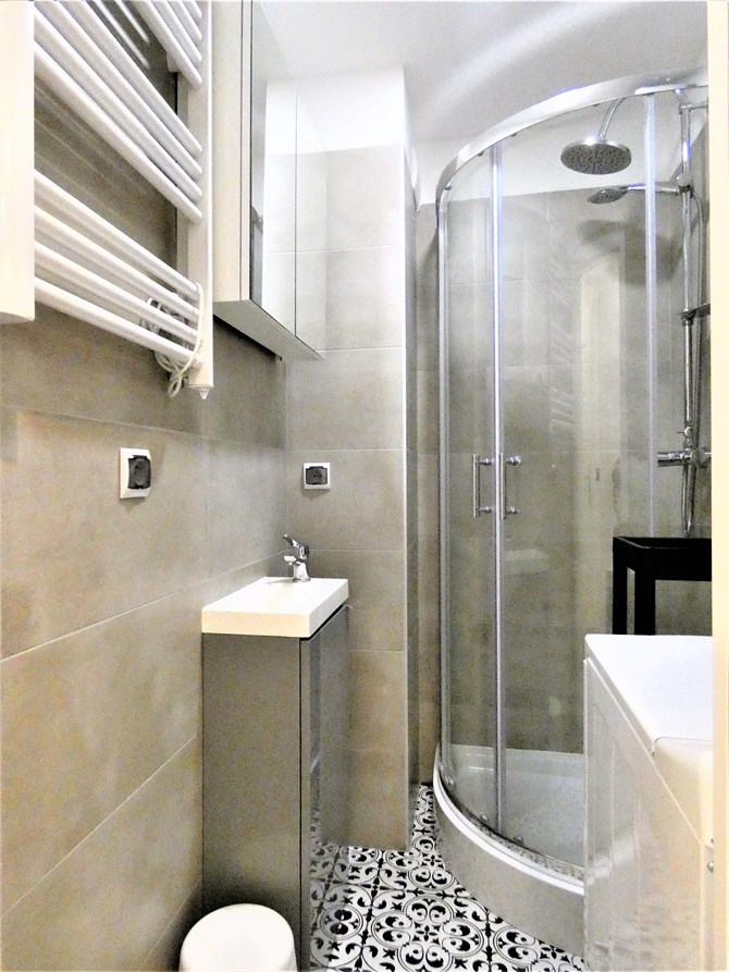 Łazienka: kabina prysznicowa, umywalka, szafka wisząca i stojąca, pralka, regał.