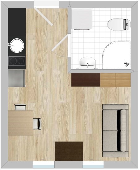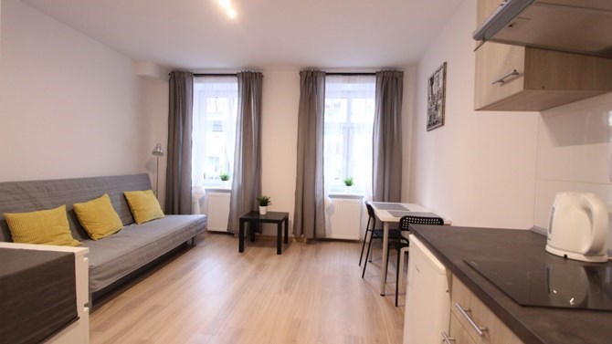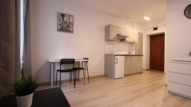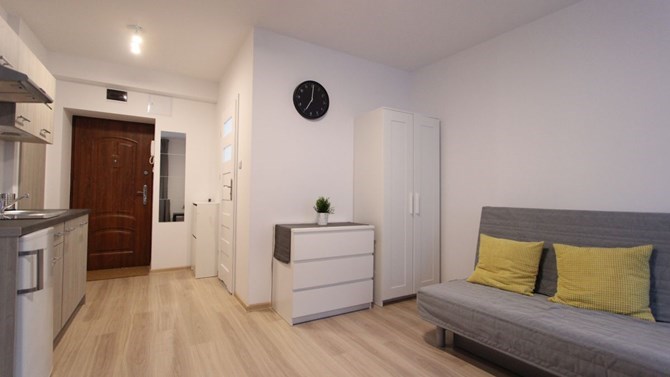 *Mieszkanie składa się z pokoju z aneksem kuchennym oraz łazienki połączonej z WC.