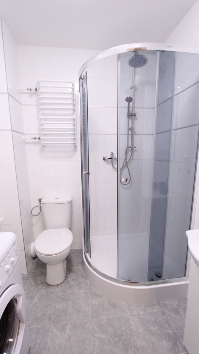 *W łazience kabina prysznicowa, umywalka, pralka i WC.