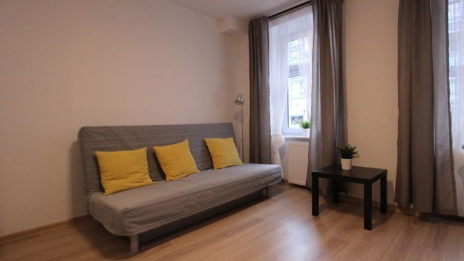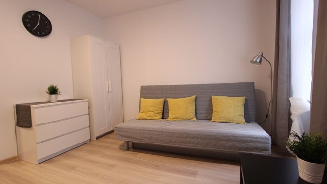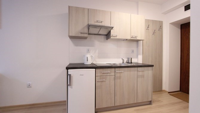 *W pokoju szafa, stolik, komoda i rozkładana sofa. *Kuchnia w aneksie wyposażona w kuchenkę elektryczną, lodówkę i czajnik elektryczny.