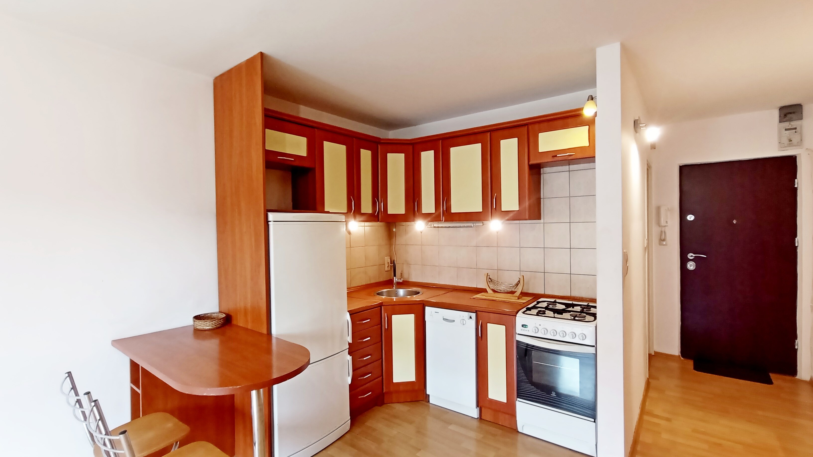 Kuchnia: lodówko-zamrażarka, zmywarka, 4-palnikowa płyta gazowa, piekarnik, czajnik elektryczny, zlewozmywak.