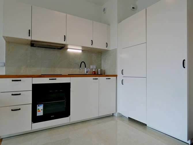 Kuchnia: lodówko-zamrażarka, okap, 2-palnikowa płyta indukcyjna, zmywarka, piekarnik, zlew, stół + krzesła.