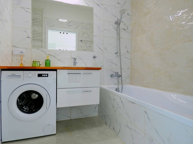 Łazienka: pralka, WC, wanna, umywalka.