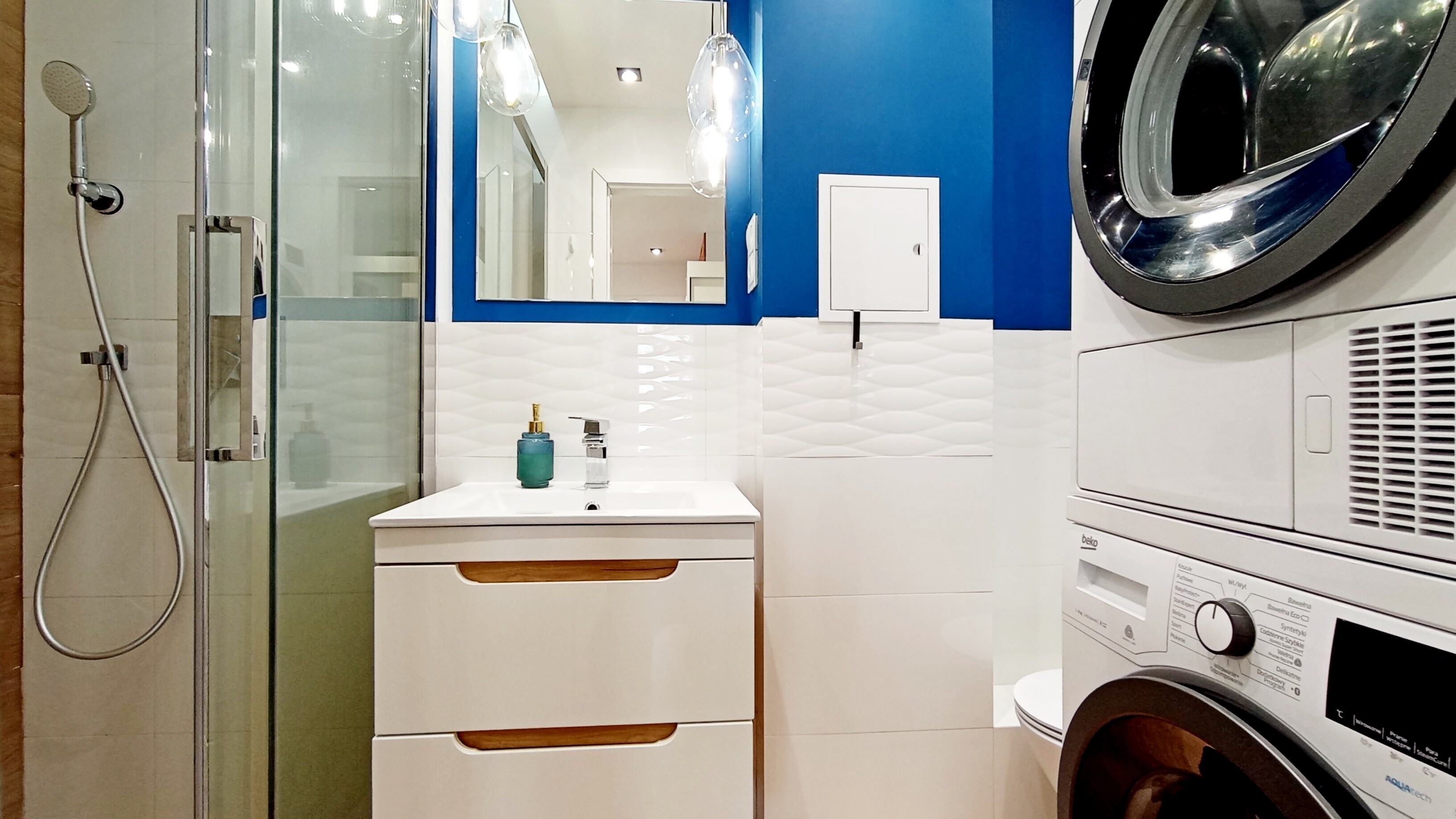 Łazienka: pralka, suszarka, prysznic, WC, umywalka.