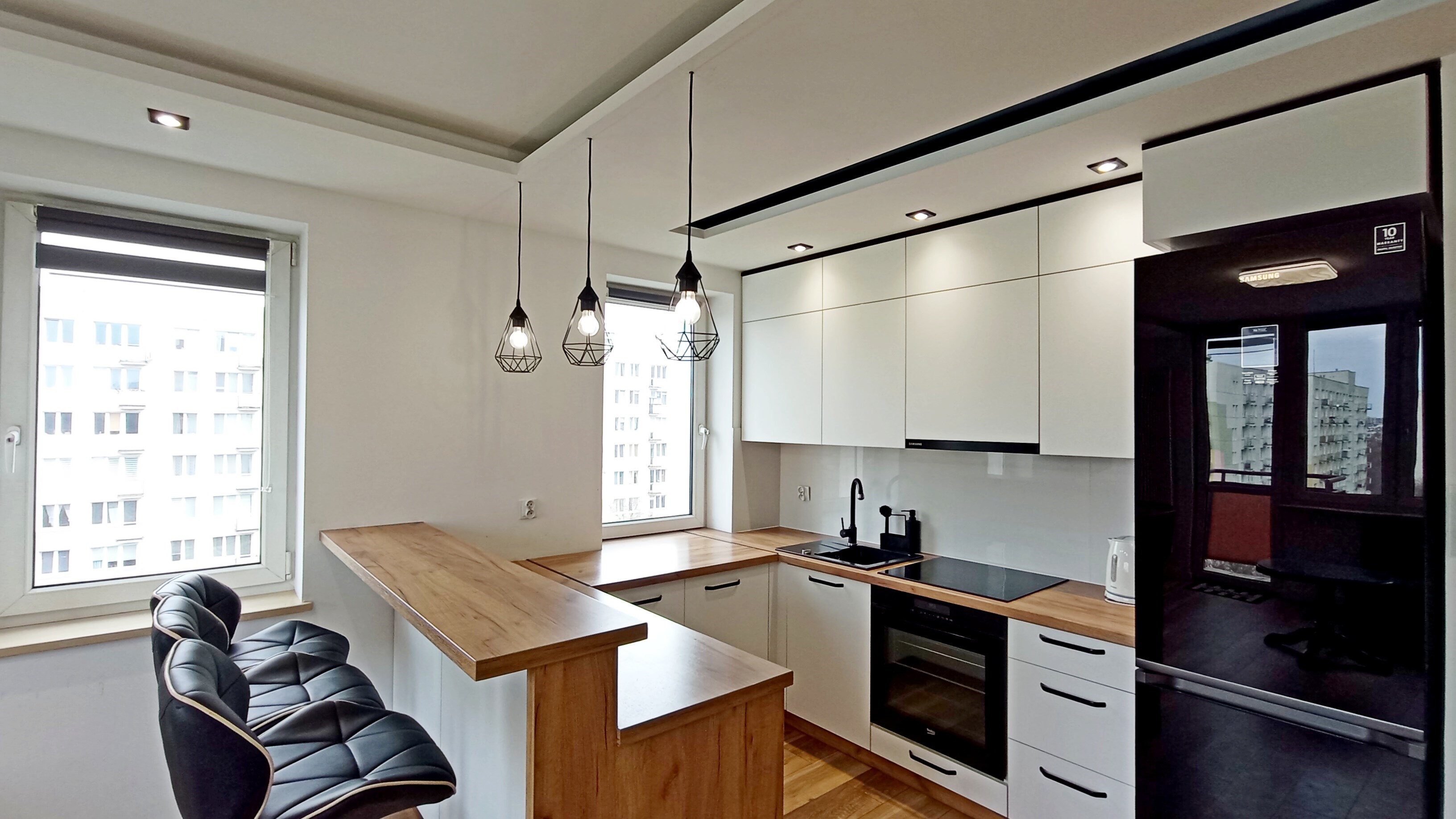 Kuchnia: lodówko-zamrażarka, zmywarka, okap, 4-palnikowa płyta indukcyjna, piekarnik, czajnik elektryczny, zlewozmywak, wyspa + 3 x hoker.