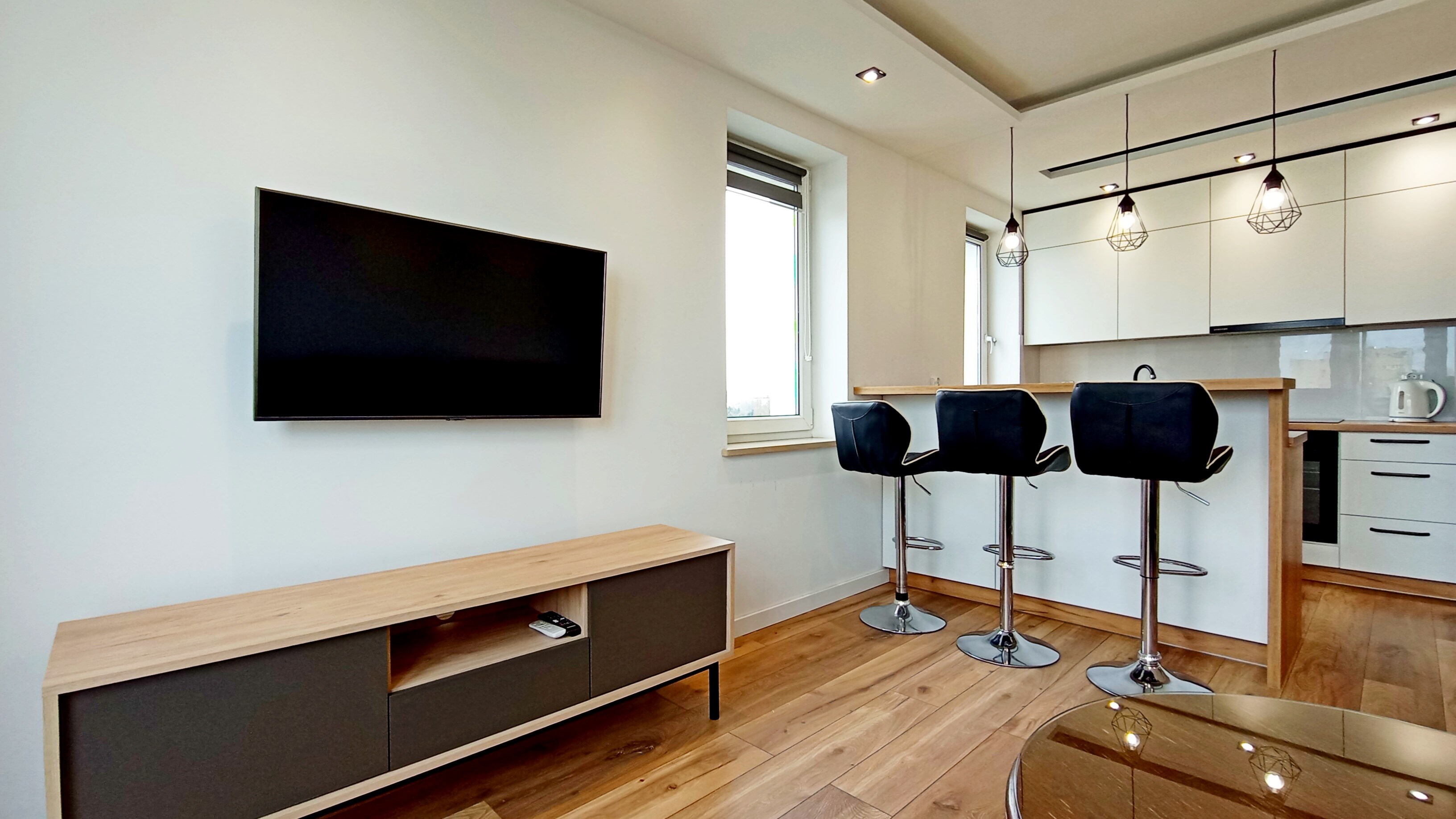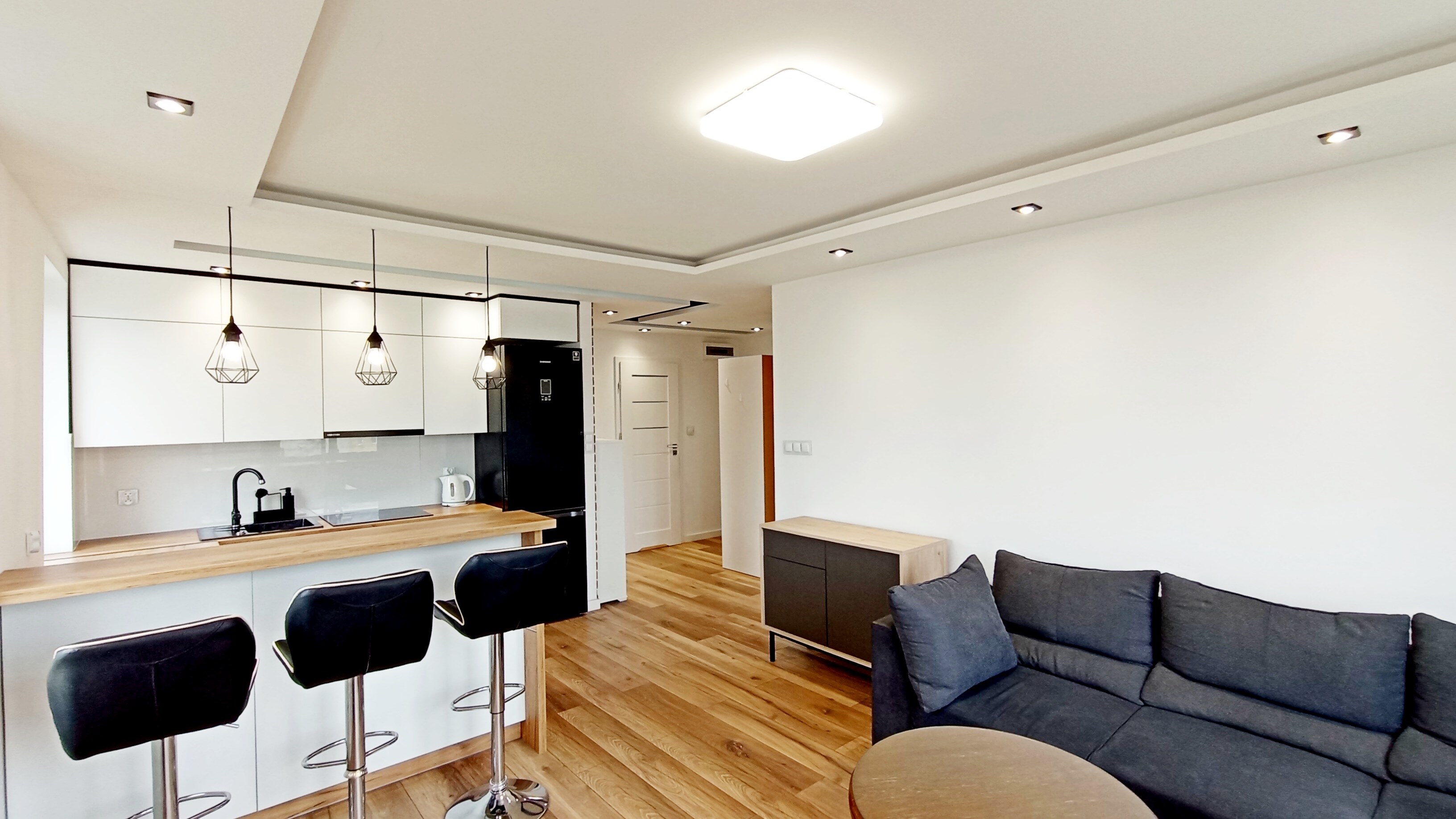 Mieszkanie o powierzchni 45,5 m² składa się z salonu z aneksem kuchennym,