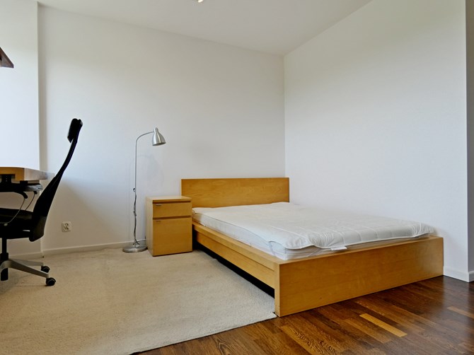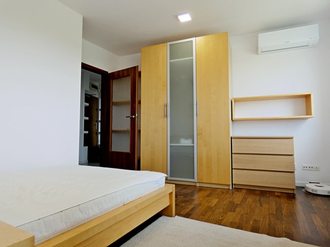 Sypialnia: podwójne łóżko z materacem, biurko + krzesło, szafa, komoda, klimatyzator, szafka nocna, lampa stojąca, iRobot Roomba.