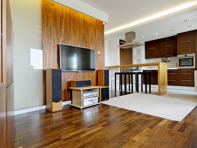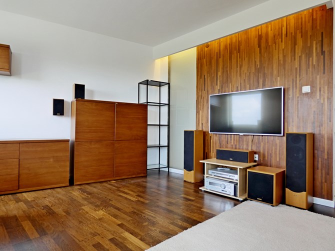 Salon: sofa rozkładana, komoda, szafa, regał, biurko + krzesło, TV, kino domowe 7.1, DVD, amplituner, ruter, klimatyzator.