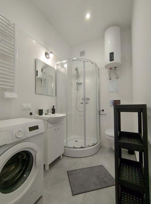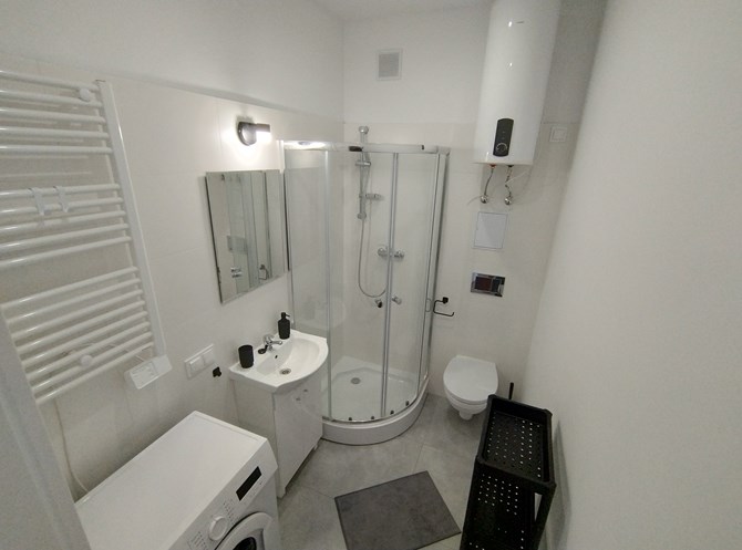 Łazienka razem z WC: kabina prysznicowa, lustro.