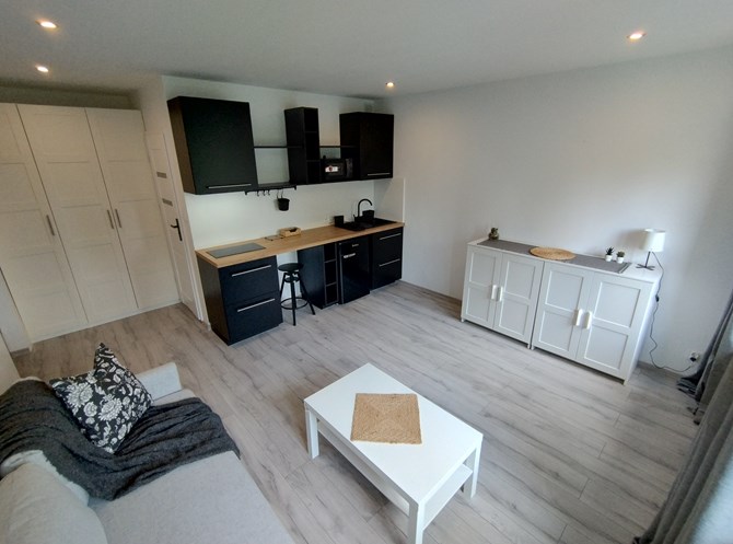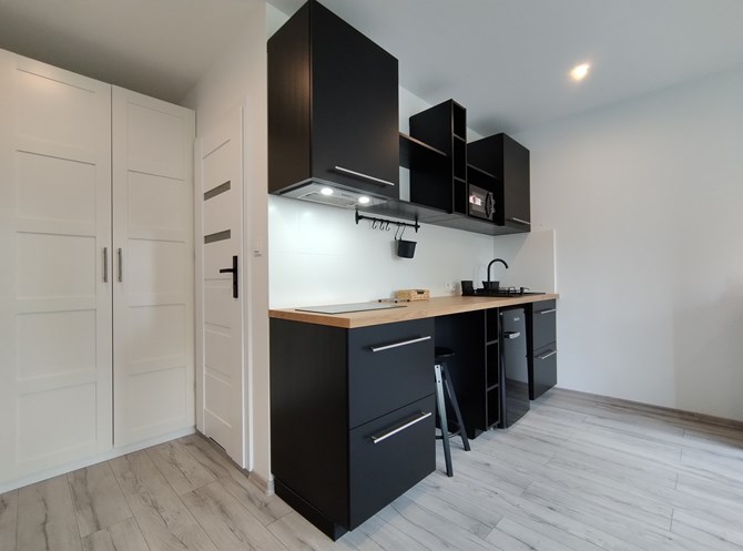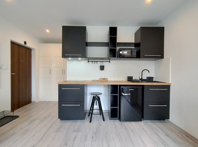 Aneks kuchenny: szafki wiszące i stojące, lodówka, dwupalnikowa płyta elektryczna, zlewozmywak.