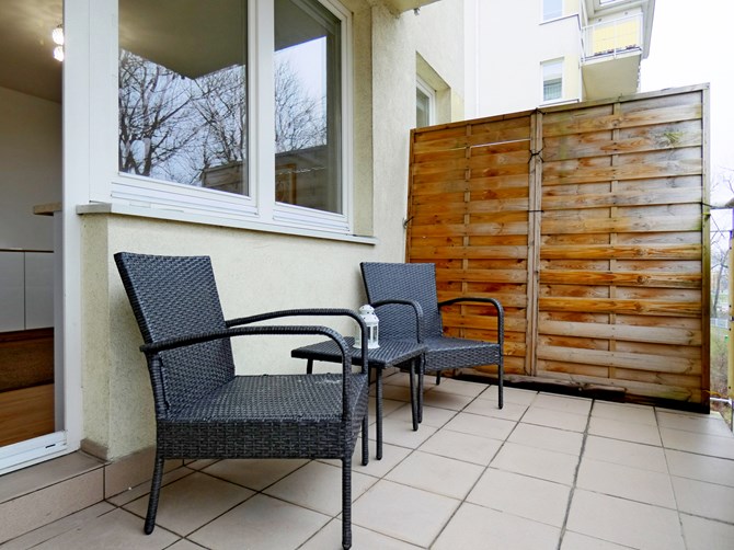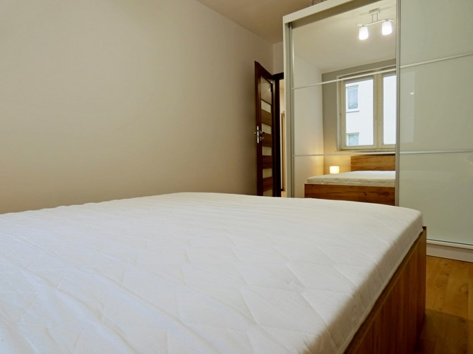 Składa się z salonu, sypialni, oddzielnej kuchni, łazienki, przedpokoju oraz dużego balkonu.