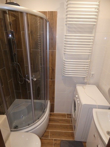 Łazienka z WC: kabina prysznicowa, pralka, umywalka, bojler elektryczny