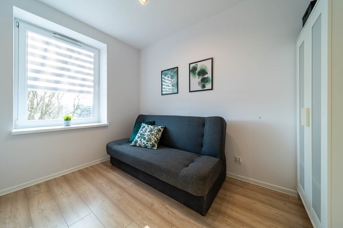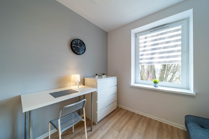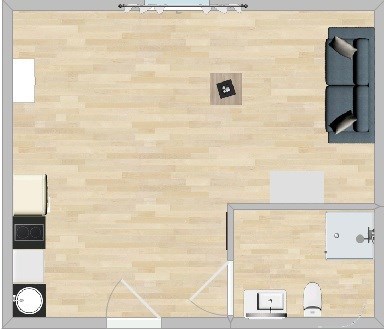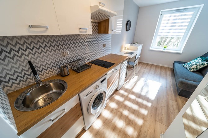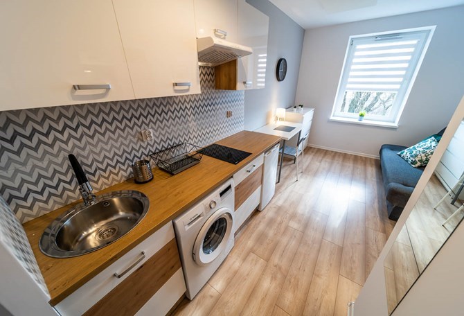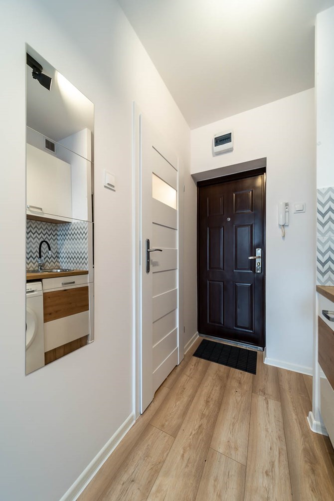 Studio składa się z pokoju z aneksem kuchennym, łazienki oraz przedpokoju.