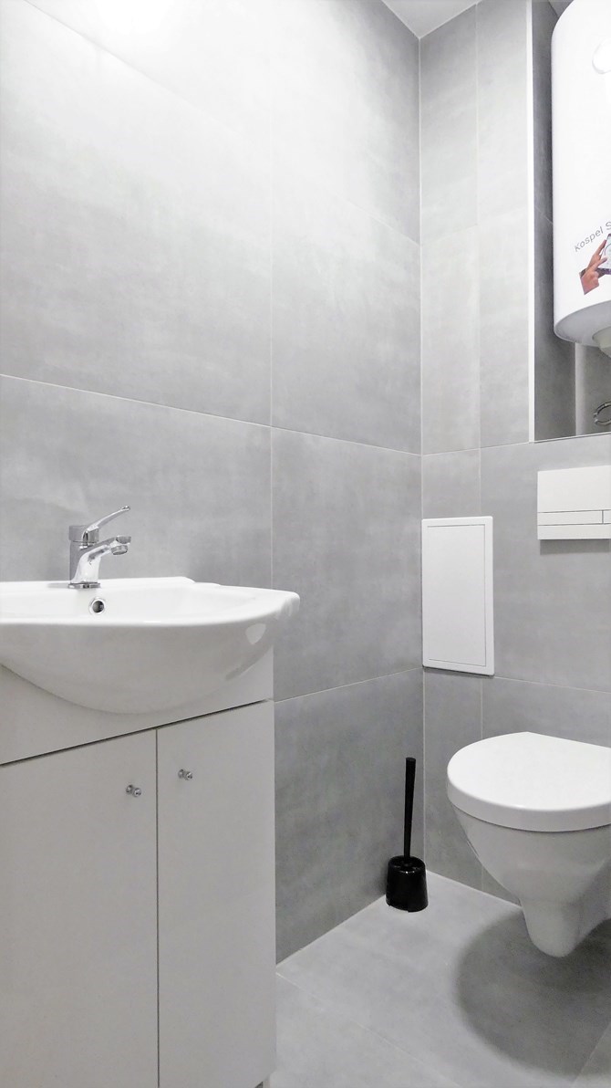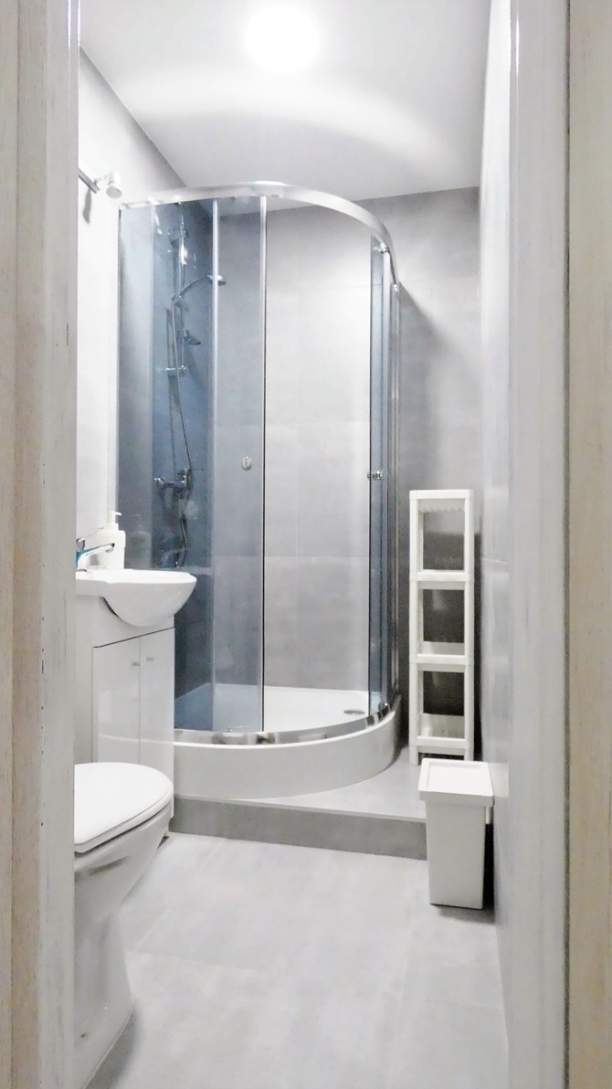 Łazienka z WC: kabina prysznicowa, umywalka z szafką, pralka.