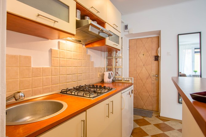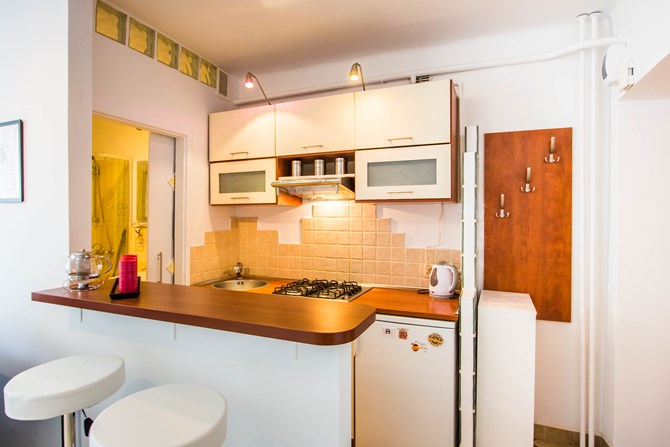 Aneks kuchenny: szafki kuchenne, lodówka, okap, czajnik, kuchenka gazowa, blat z dwoma krzesłami.