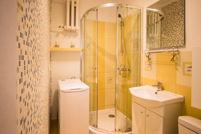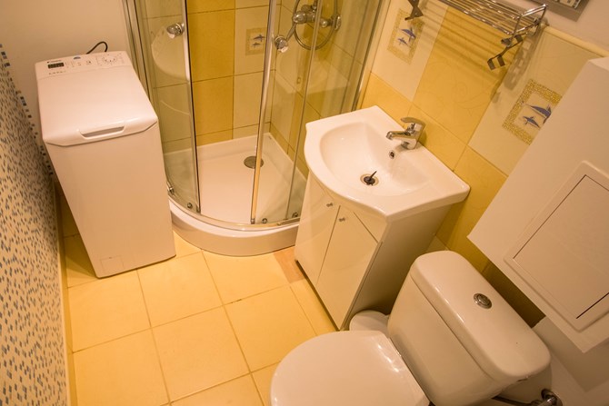 Łazienka: kabina prysznicowa, umywalka z szafką, pralka oraz WC.