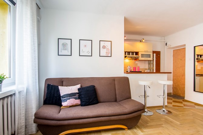 Do wynajęcia przytulna, w pełni umeblowana kawalerka przy ul. Gandhiego 4 w Łodzi.