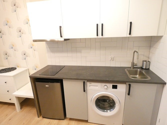 Aneks kuchenny:: lodówka, 2-palnikowa płyta indukcyjna, okap, zlew, pralka.