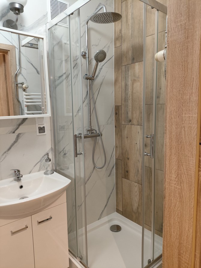 Łazienka z WC: kabina prysznicowa, umywalka, szafki.