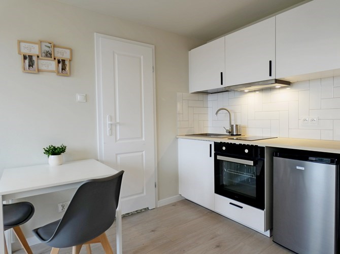 Kuchnia: lodówka, 2-palnikowa płyta indukcyjna, piekarnik, okap, zlew.