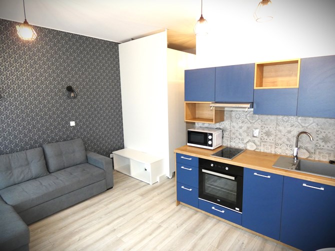 Do wynajęcia jasna, nowoczesna kawalerka w pełni umeblowana i wyposażona w sprzęt AGD, zlokalizowana przy ul. Grabowej 11, w zielonej i dobrze skomunikowanej części Łodzi.
