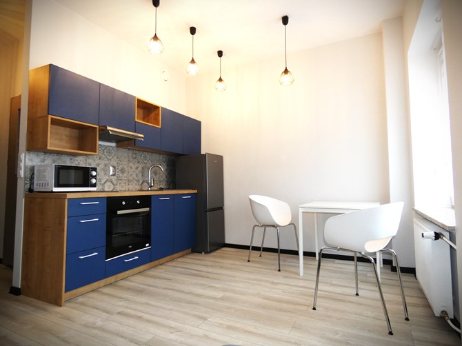 Pokój z aneksem kuchennym: szafki wiszące i stojące, stół z 2 krzesłami, rogówka z funkcją spania, mikrofalówka, okap, lodówka, piekarnik elektryczny, dwupalnikowa płyta indukcyjna, dodatkowa szafka.