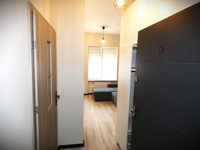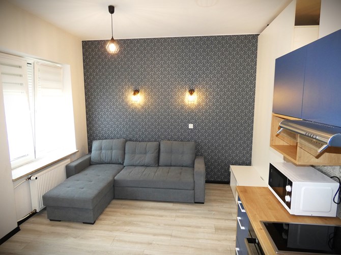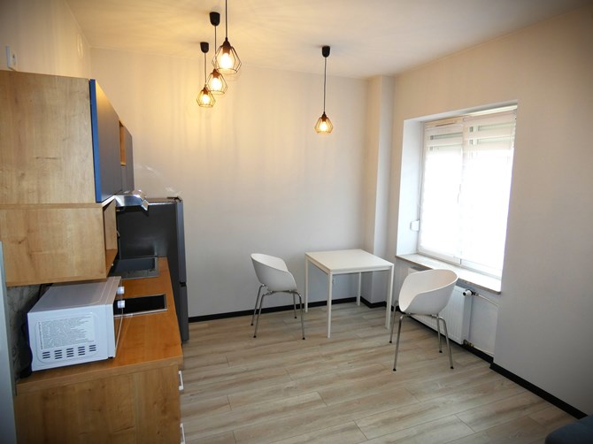 Funkcjonalny układ – pokój z aneksem kuchennym oraz łazienka z WC.
