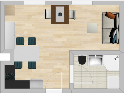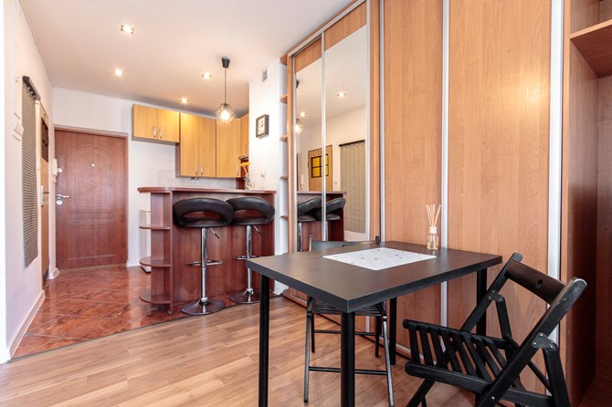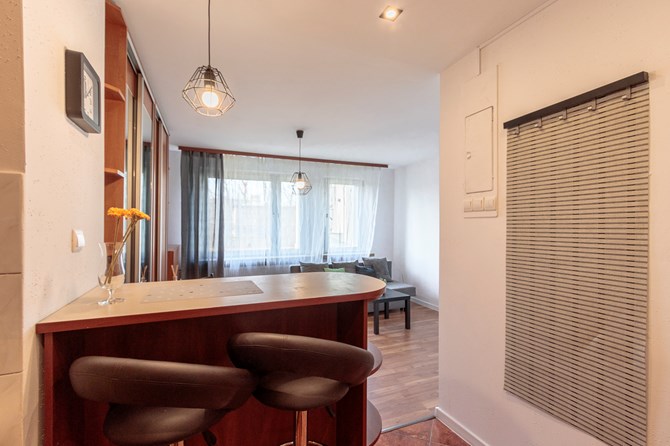 Kuchnia: połączona z pokojem wysokim blatem z dwoma wysokimi hokerami.