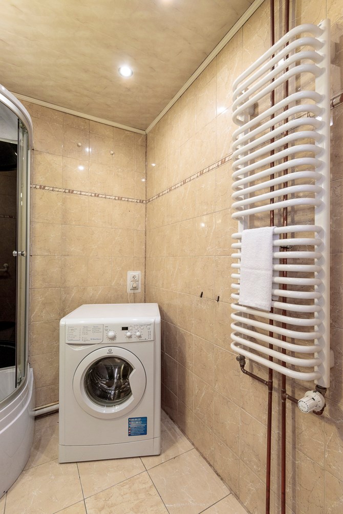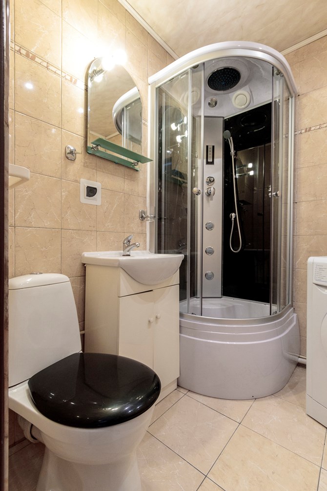 Łazienka: kabina prysznicowa, umywalka, WC i pralka.