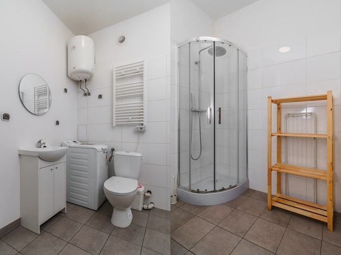 Łazienka: kabina prysznicowa, umywalka, lustro, pralkę, oraz WC.