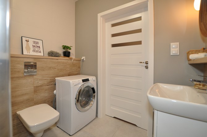 Łazienka razem z WC: lustro, kabina prysznicowa, pralko-suszarka