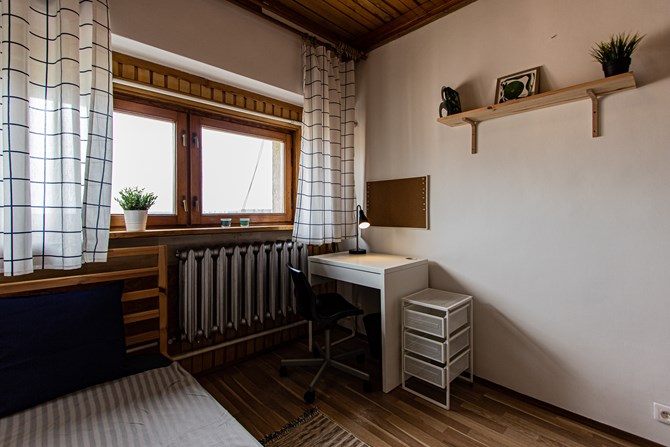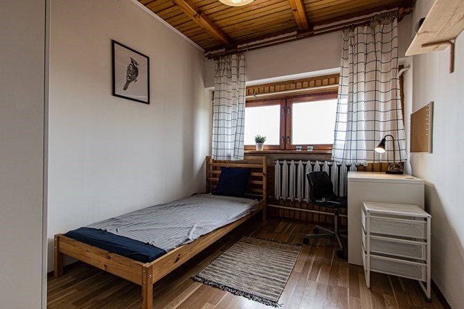 Pokój: rozkładane łóżko, biurko, fotel obrotowy, pojemna szafa na prywatne rzeczy, dodatkowa przestrzeń na własne umeblowanie.