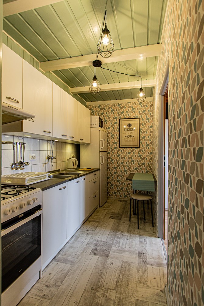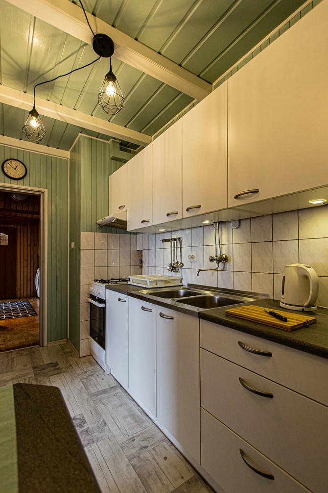 Kuchnia: meble kuchenne, kącik jadalny, kuchenka z piekarnikiem, czajnik, chłodziarko-zamrażarka.